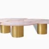 The Antico Table combines the warm texture of wood with a minimalist sculptural form. The top is crafted from fine veneer with handpicked linear grains resting seamlessly on a delicate brass metal frame, while a hand-carved Irish shilling sculpture at the center adds an element of interest to the table top.