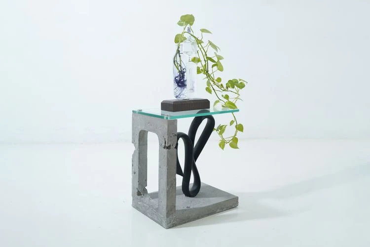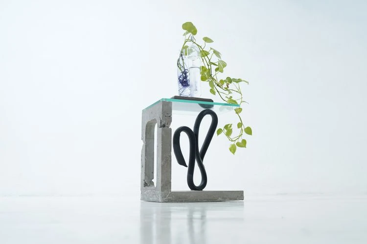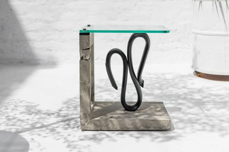 This side table flaunts a frame of concrete and wood. It becomes whole when topped with a glass top that floats dramatically above the deformed steel bar. The cool black twist makes it a vibrant and striking piece of furniture. Ideal to complement all decor schemes.