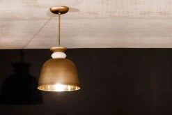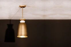 Inspired by traditional temple bells these adjustable pendant lights are available in two forms- fat and long. The matte satin exterior finish is contrasted with the spun brass interior that will reflect a glow of light as warm as the tone of the bells they mimic.