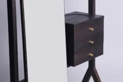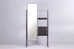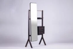 Cleopatra is a dressing unit created for bedrooms and walk-in wardrobes. The design aims to promote an inspiring and elevated everyday ritual of dressing. The inspiration is derived from an artist’s easel, both structurally and functionally. A user becomes his/her own artist in the rituals of powder and preen. Cleopatra boasts a captivating contrast of shimmering brass, a full-length mirror, and solid wood, three key materials used in the design. The design reveals thoughtful and refined brass and wooden details that hold daily essentials and accessories.