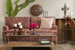 Showcasing a rich, jewel-toned upholstery from the House of Sabyasachi as a tribute to the grandeur of festivities in India, this two-seater sofa is a timeless staple in the living room, bedroom, or den.