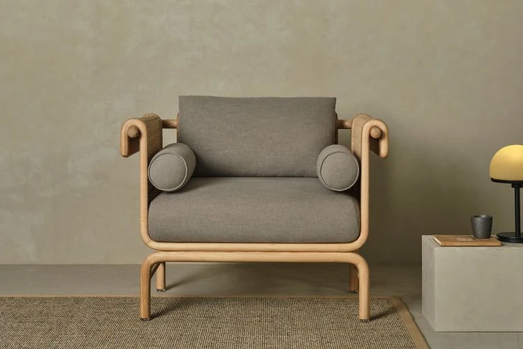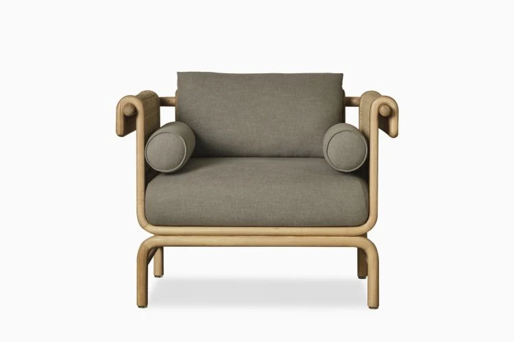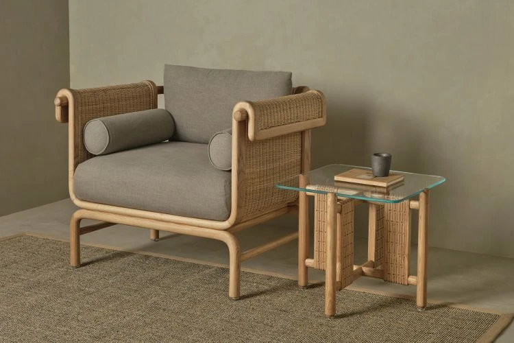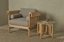 This single seater is a delightful juxtaposition between a restrained frame, and plush wooden curves. Woven wicker elegantly wraps around the armrests in a regal manner, creating a generous space that celebrates an individual sense of comfort.