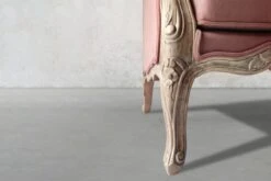 Contrived in solid wood, hand carved and stained to give a distressed French-esque finish in a beautiful dusty rose upholstery, this modern day marvel can rock any decor scheme with its classic design.
