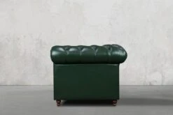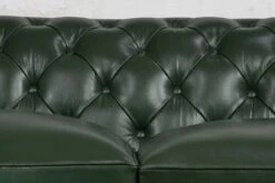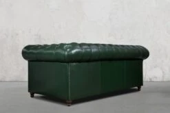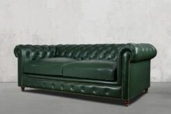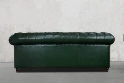 19th century Chesterfield design with buttoned back and stubbed detailing creates a luxurious look with the Gentleman’s Club Chesterfield Sofa. Handcrafted in vintage-finish genuine leather in bottle green color, this sofa with wooden bun legs and brass nails makes a picture-perfect traditional classic.