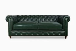 19th century Chesterfield design with buttoned back and stubbed detailing creates a luxurious look with the Gentleman’s Club Chesterfield Sofa. Handcrafted in vintage-finish genuine leather in bottle green color, this sofa with wooden bun legs and brass nails makes a picture-perfect traditional classic.