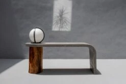 The Glow Love Bench is a concrete terrazzo bench top that goes across the length of the table and is then curved to form one support leg to the structure. The other side of the bench is balanced with a polished solid natural wooden trunk. The bench comes with a large dome light that adds to the functionality and an aesthetic element to the product.
