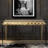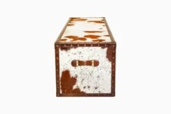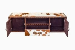 This luxe console is handcrafted in genuine hairon calf leather, suede fabric and hand-studded brass hardware. It comes with 2 doors opening each side and a single drawer in the centre with an open shelf.