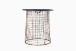 The striking Hestia End Table looks remarkable with its mixed material accent reflecting the rhythm of modern architectural construction. Hand-welded spokes of brass-finished iron wires shape the end table’s free flowing chequered base, topped with a stylish matte disc.
