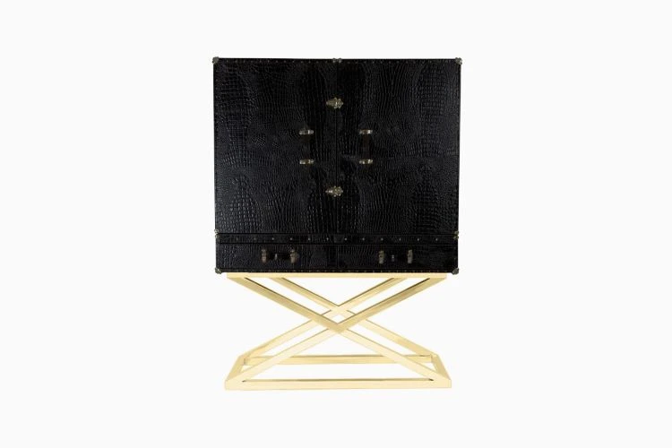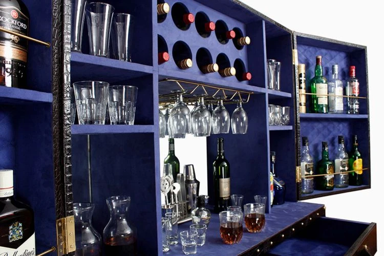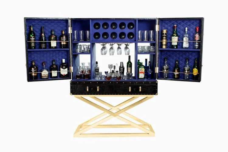Luxury in each detail – this fine crocodile print leather with blue suede lining and cast brass hardware features shelves designed to accommodate all size glasses, bottles and cocktail accoutrements for the discerning mixologist.