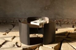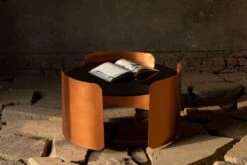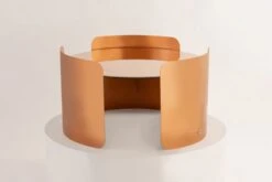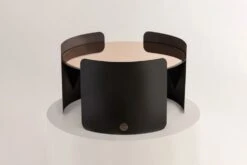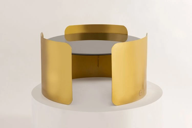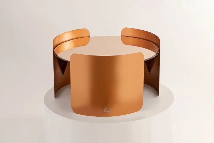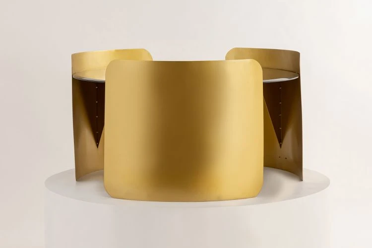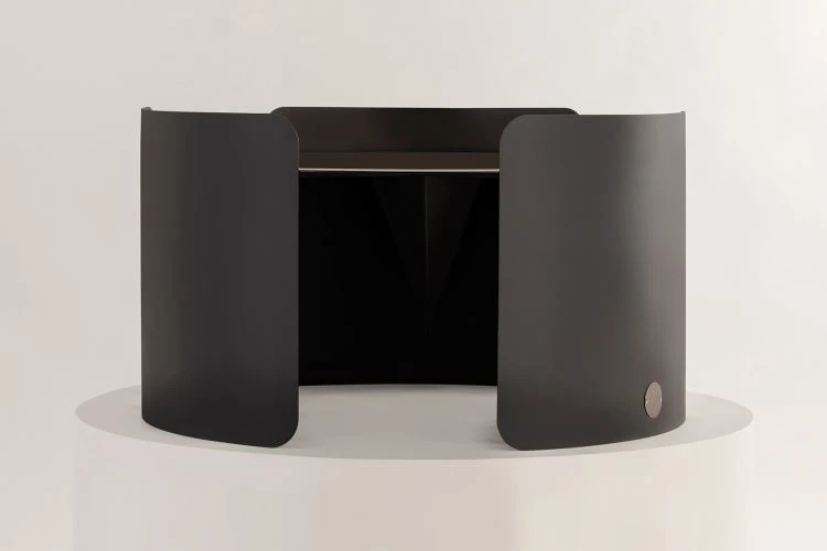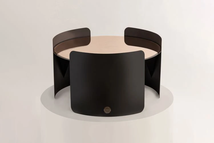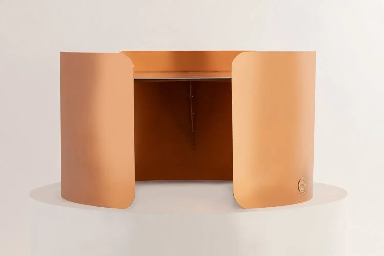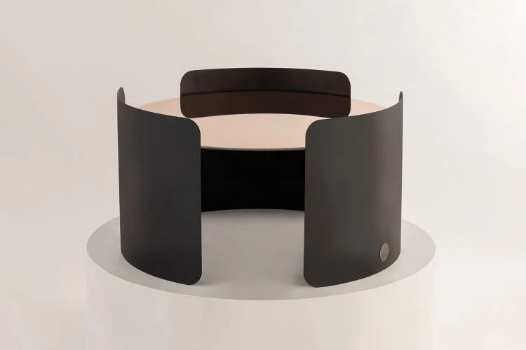 The circular top is gracefully enveloped by three metal sheets, curving around it like a loving hug.
