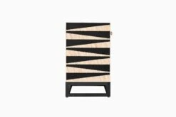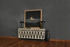 Masterfully fusing understated refinement with functionality, this sideboard is crafted from select solid wood and ethically sourced bone components, boasting dimensions that are just right for a dining or lounge space.