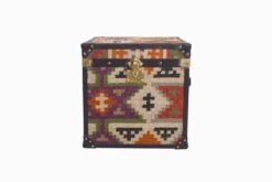 A perfect blend of kilim and leather detailing designed with suede lining inside, this trunk style side table offers a unique design and storage space capabilities.