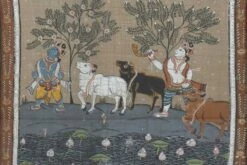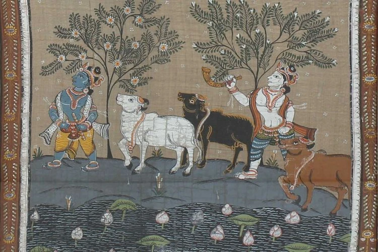 This exquisite wall art has been handpainted with Pattachitra artwork on cloth. Featuring Lord Krishna with his favourite cows, the artwork is typically mythological in nature with emotive facial expressions.