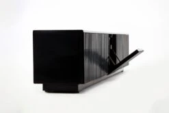 This media console is a combination of a unique design and simple shapes paired with high-quality materials. In addition to the vertically arranged slats in the accordion-style, the rounded front edges above the folding doors, the body, and the folding door of the console are made of HDMR board. This is a three push-pull flap doors wooden cabinet. Also available in the version of 2 doors.
