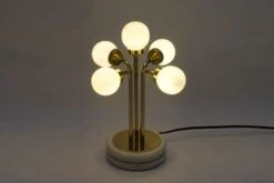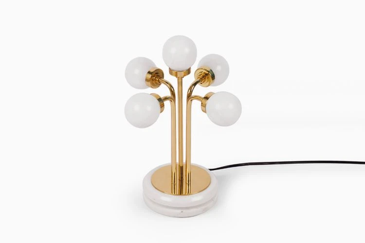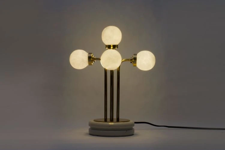 Standing on a marble base with steel pipes branching out of it into moon bulbs made in alabastor stone, it is a product that highlights a space in a laidback yet focused way.