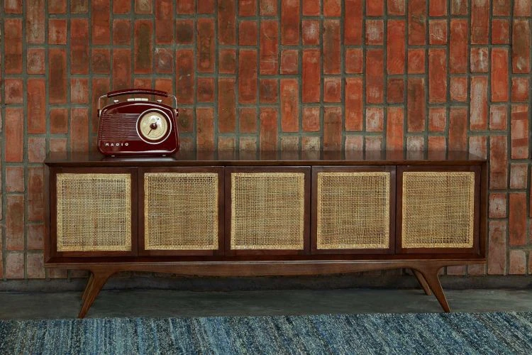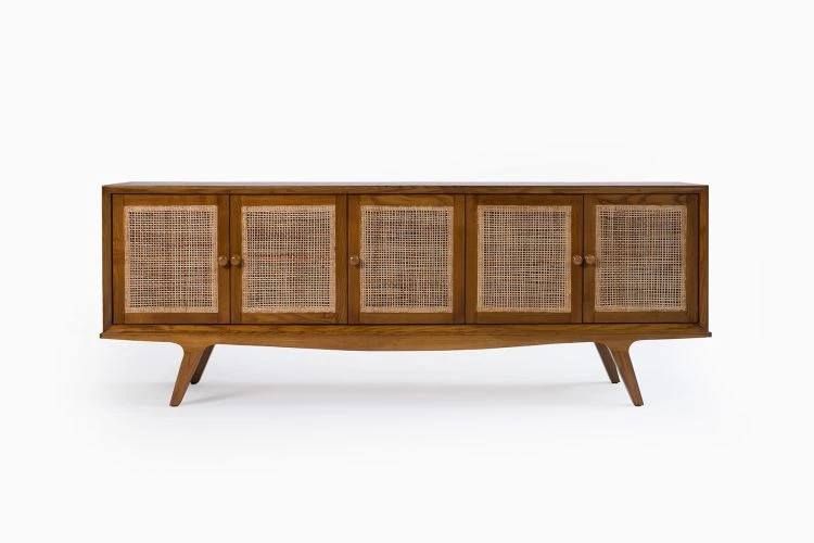 Add a globally inspired natural touch to your dining room decor with Malaga. This wooden buffet showcases a plywood make with teak veneer and woven cane shutters for a charming transitional allure.