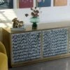 Handcrafted in vintage tan croc embossed leather, this sideboard makes a style statement in any entryway or lounge space. Effortlessly crafted from genuine leather with antique hardware detailing.