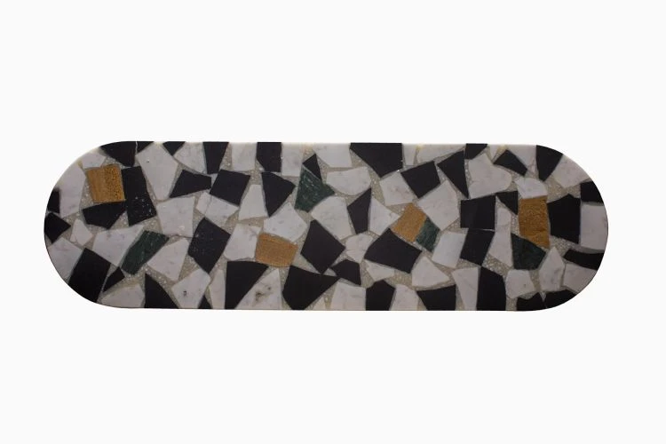 The Mausam Console with a recycled marble terrazzo top adapts to incorporate a waste reducing method. The top is made from marble off cuts set into resin, aiming to reduce the waste from the marble industry. The pieces used to create the mixed tops vary in size and colour but can be customized to suit any space.