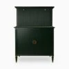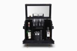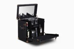 This modern mini bar unit is made in fine quality leather laminated on fine wood base with velvet lining and hand-studded antique hardware. It helps keep bar essentials in a compact size by accommodating up to 4 bottles with room enough for glasses and other bar accessories.