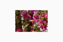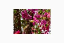 A Purple-rumped sunbird stretching to feed from a bougainvillea flower.