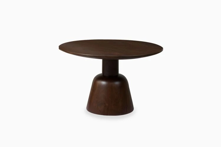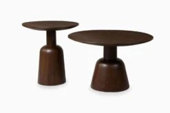 Boasting a circular surface and a sculptural squat base, these tables feature a lathe turned technique infused with urban appeal thanks to the dramatically dark teak wood structure.
