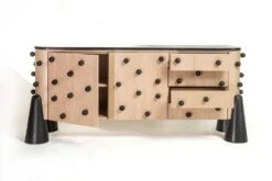 Showcasing a play in forms and proportion, Otsu has an artistically inclined aesthetic. Featuring hand carved solid granite legs, a black marble top, and black stained wooden balls, accompanied with the rounded cone legs make this piece a conversation starter.