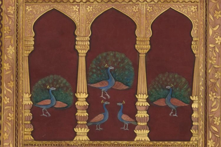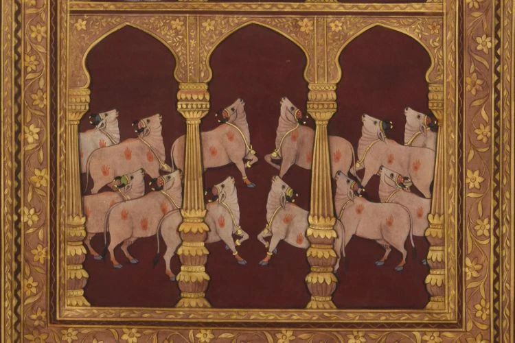 The painting also showcases the ‘kadamba’ tree, frolicking peacocks, and the Lord’s favourite cows populating the scene.