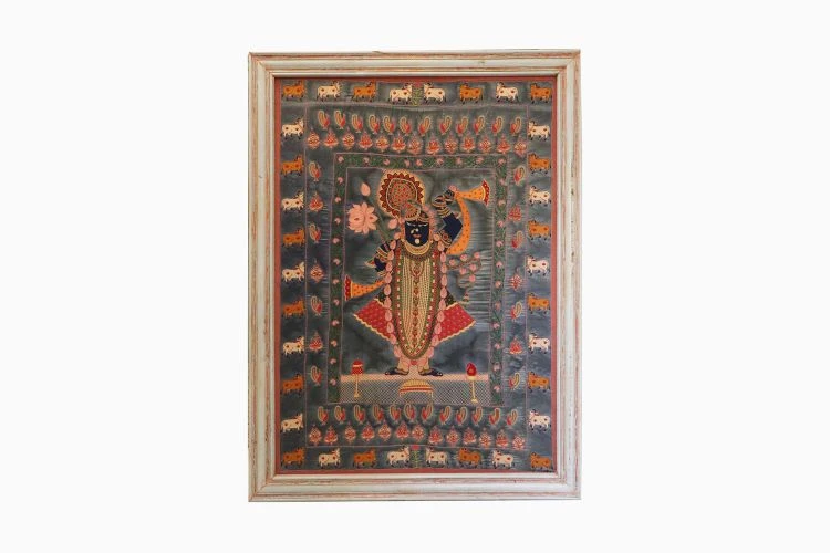 Adorned in rich garlands is a beautiful rendition of Shrinathji with Kamdhenu cows. As he takes them for grazing, a beautiful scene of peacocks dancing around a lotus pond has been depicted.