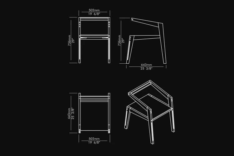 Three Dots and a Dash (…-) plays with the idea of splitting and removing the critical component of a structure of a traditional chair. The key element in the design is its metal insertions that provide structural strength. The insertions have been strategically placed as the’ Three Dots and a Dash’ motif (…-), a Morse Code for victory. The chair has minimal foam padding at the back. It also has a provision for upholstered seating.