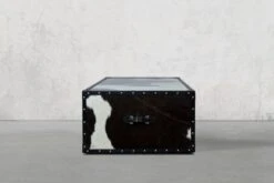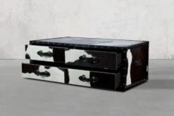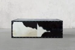 A luxury trunk styled coffee table hand crafted in genuine natural black & white hair-on leather, lined with suede fabric and hand studded brass hardware. This table comes with 3 drawers opening from front and a transparent glass top.
