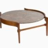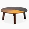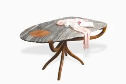 Vārdhitā Mejā as a sculptural piece of furniture is inspired by Mesolithic Period and Neolithic Period tools and named as a carved piece. Made in Indian marble with solid teak wood legs, the bio-organic form emphasizes the materiality of the stone, the natural beauty of its veins with wood inlaid in it. Inspired by stone age tools of 10,000 BC to 4000 BC axes and hammers, the table top combines and creates a unique detail. Bringing personality to private settings and naturalness and tactility to public interior spaces, Vārdhitā Mejā is made of the finest materials contributing to its unique and exclusive identity, and brings people together.